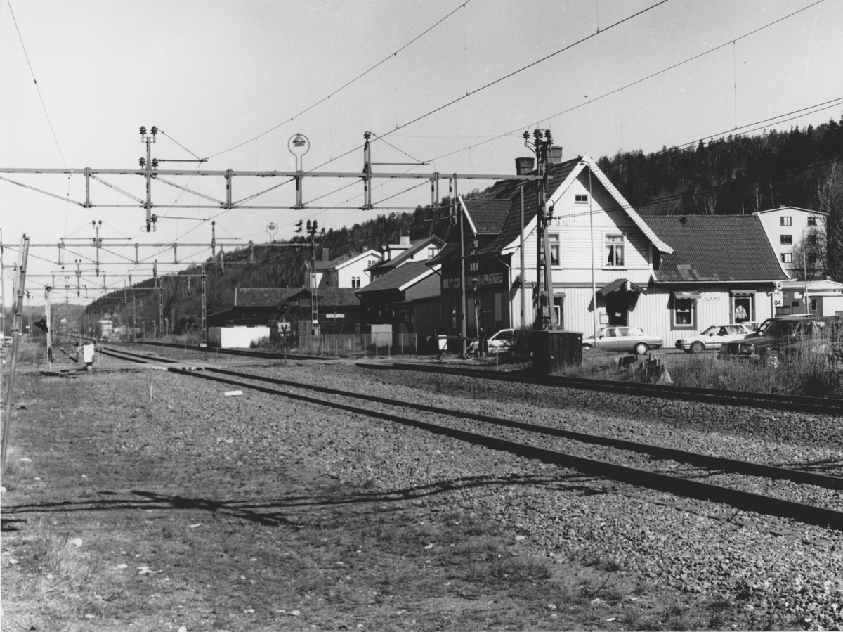 Järnvägsspåren vid Kållered Station, april 1988. Caiber jeans drev affär i bottenvåningen.
