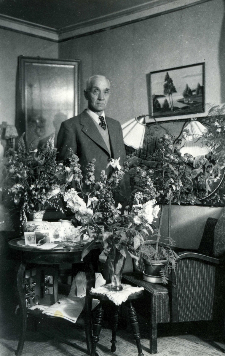 Olof Olsson (1883 - 1958) omgiven av buketter i sin bostad "Alphyddan" Torrekulla 1:25 på Gamla Riksvägen 13, okänt årtal. Han var S-politiker i Kållered samt skötte ABF-bilblioteket.