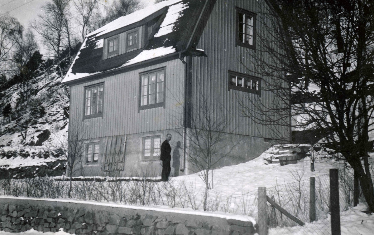 Husägaren Olof Olsson (1883 - 1958) står utanför "Alphyddan" Torrekulla 1:25, Gamla Riksvägen 13, okänd årtal. Det är vintertid och snö runt omkring. Huset uppfördes 1933.
