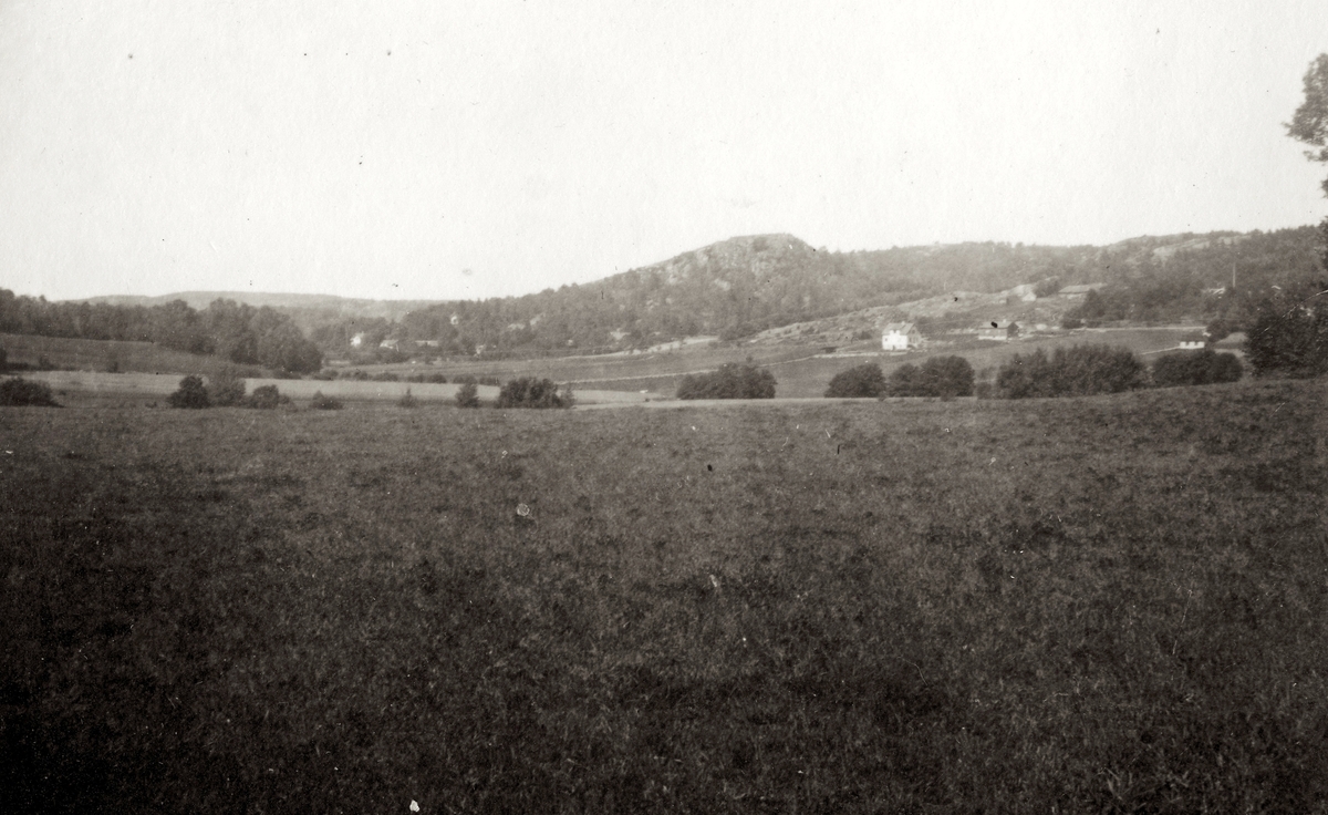 Vommedalen med Brattåsberget i bakgrunden, cirka 1940. Till höger ligger det vita huset "Anneberg" och intill ligger familjen Wedrups "Kullagård". Båda byggnaderna revs år 2020.