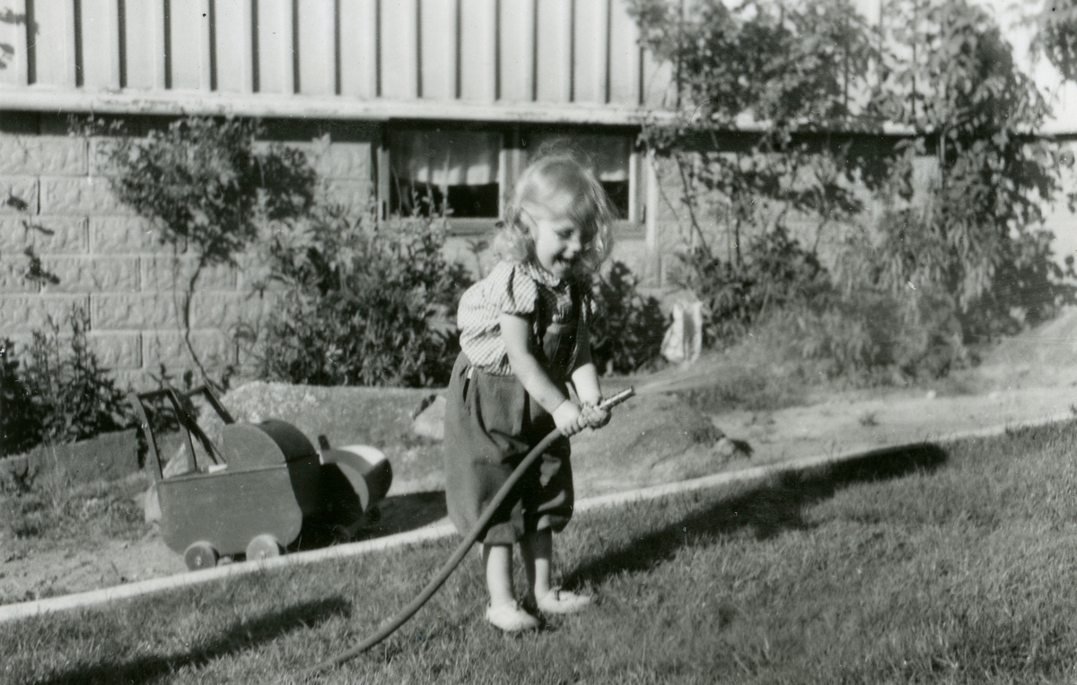 Karin Pettersson (född 1947) håller en vattenslang i handen på Gamlehagsvägen 17 i Torrekulla, cirka 1950. Bakom henne står hennes dockvagn utanför familjens villa.