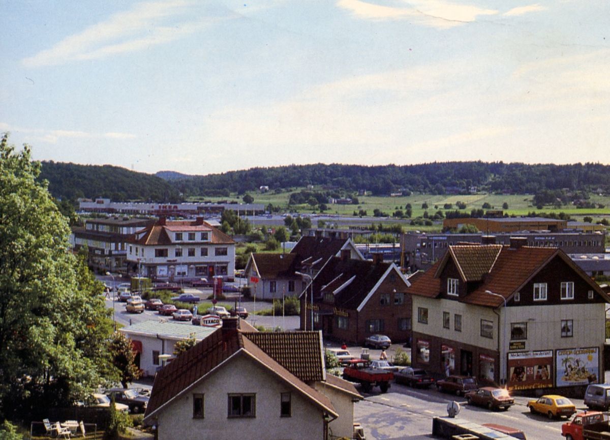 Vykort Kållereds centrum, cirka 1980. Vy från John Adolfssons lägenhet i hans hus Björlunda. Närmast ses Kållereds centrum och i fonden från vänster ligger Eken, Tållered och Heljered. Utgivet som valmaterial av Centern.