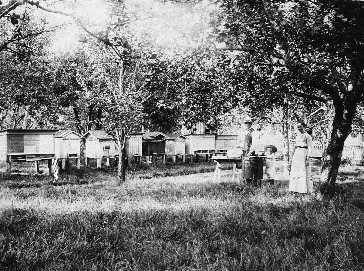 Framför de stora bi-odlingarna vid Heljered Mellangård "Store Börjes" cirka 1912. Familjen Axel Eriksson (1877 - 1958), hustrun Tekla Eriksson (1875 - 1964) och sonen Harry Eriksson (1909 - 1988).