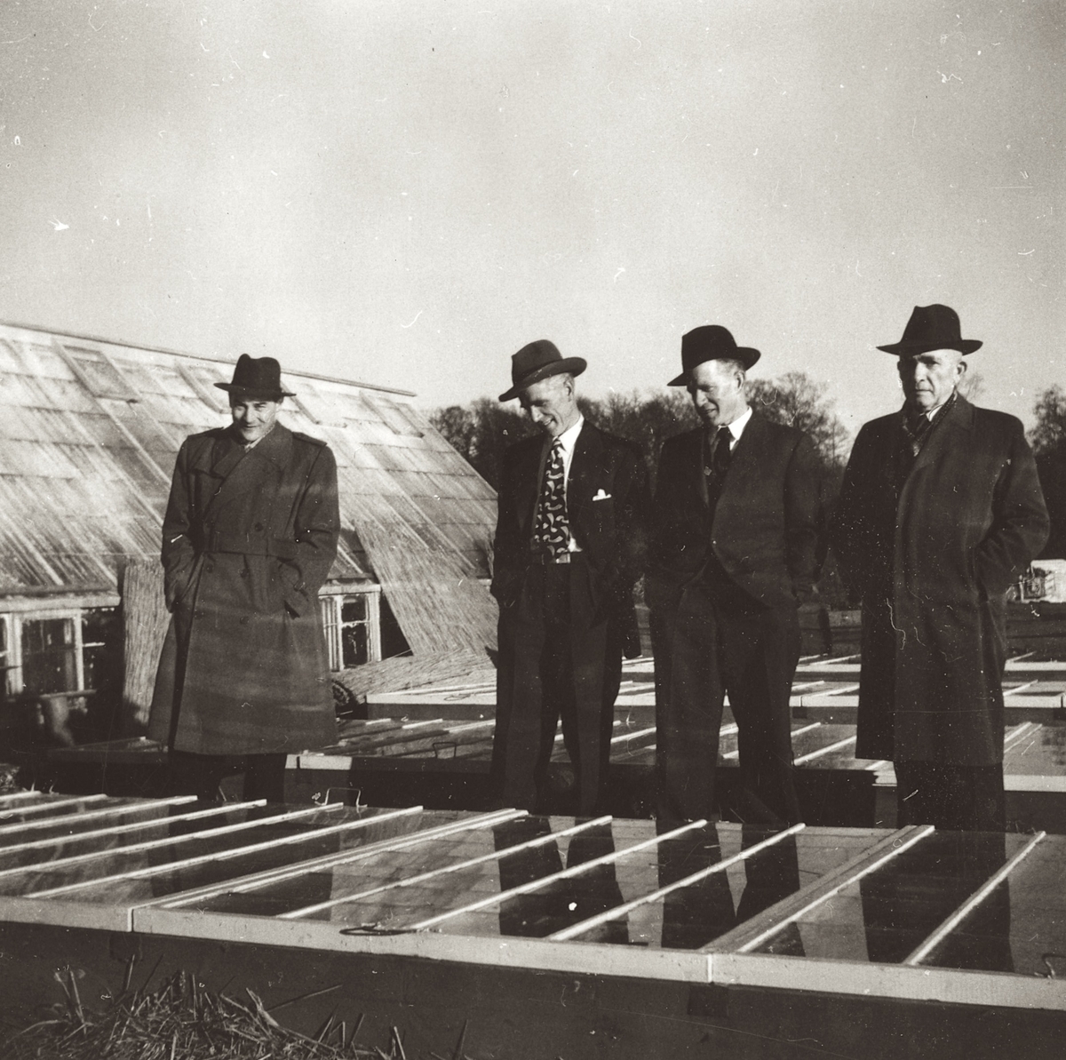 Fyra män står tillsammans vid Stretereds växthus, 1940-tal. Längst till höger ses skomakare Carl Krantz (1880 - 1956) som arbetade som lärare vid Stretereds vårdhem.