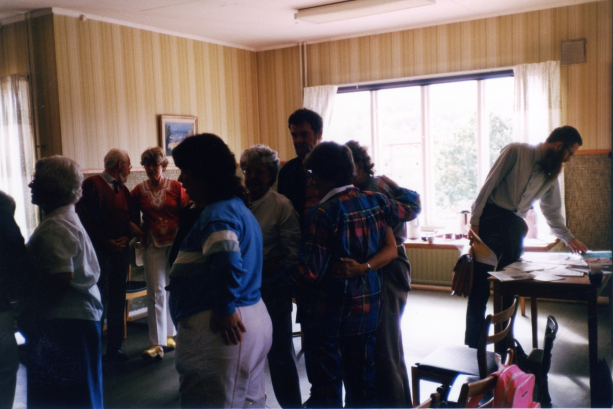 Repetition inför Bygdespelet "Brandskatten", A-salen i Kållereds Kommunalhus (Streteredsvägen 3) 1986/87. Till höger står Lars Gahrn från Mölndals Hembygdsförening.