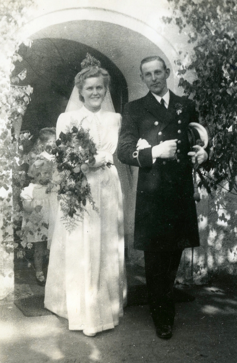 Bröllop mellan Nellie Gustafsson (1919 - 1993) och Eivind "Eje" Kullbring (1918 - 1996) som vigdes i Kållereds kyrka 1942-06-23. Paret står i ett valv utanför kyrkan. Relaterade motiv: A2839 - A2840.