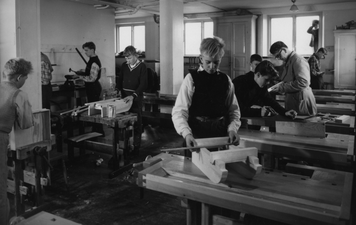 Vykort från förskolan i Stretereds skolhem (senare: Videgården), 1940- 1950-tal. Slöjdlärare Ivar Andersson (1913 - 2004) med manliga elever i skolslöjden (träslöjden) på norra källarplanet.