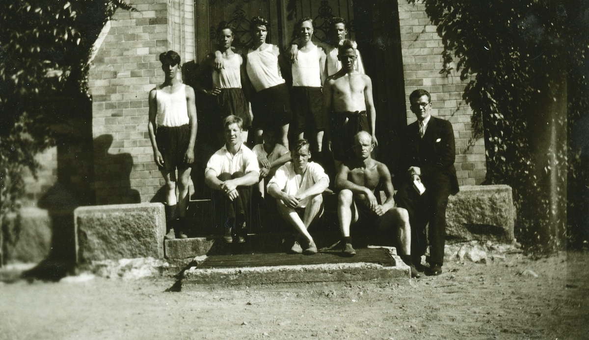 Slöjdlärare Ivar Andersson (1913 - 2004) och manliga elever poserar framför entrén till Stora skolan, Stretereds skolhem, cirka 1940. Läraren står längst till höger.