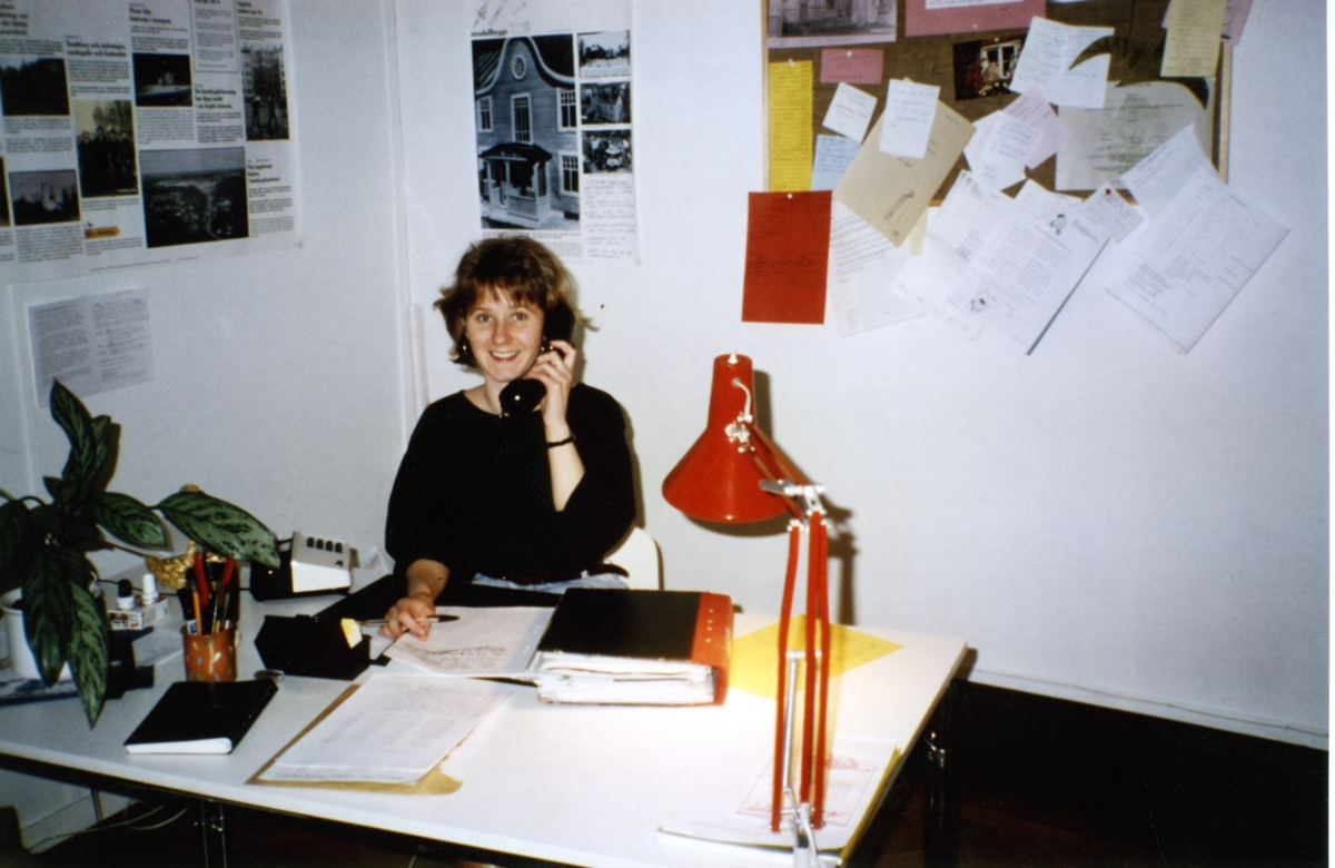 Eva Ågren (från Studieförbundet Vuxenskolan), projektledare för Bygdespelet "Brandskatten", talar i telefon år 1986. Hon sitter i Dr Björcks villa på Frölundagatan 25 B i Mölndal. Relaterade motiv: A3186 - A3251.