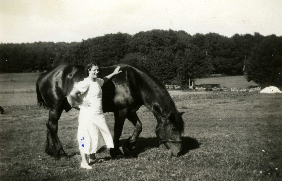 Sommargäst från Burås i Göteborg vid Tulebo Nordgård "Fredrikssons" cirka 1935. Linnea Dahlberg Fernlund (1910 - 1983) står vid hästen Bruno på en sommaräng.