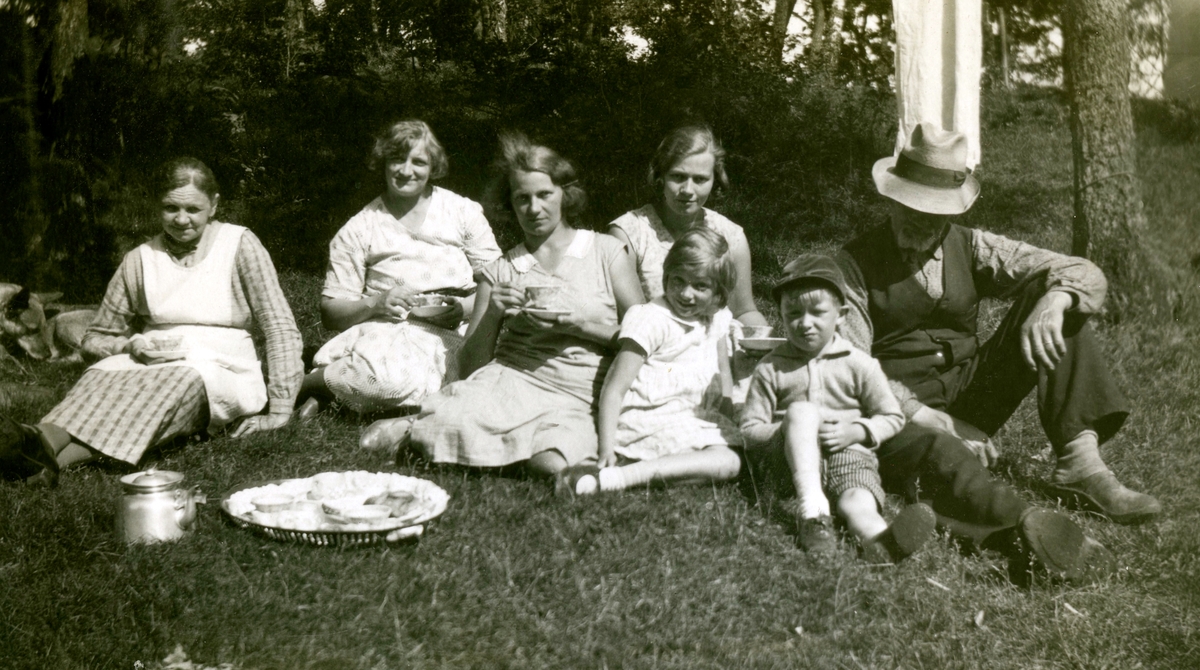 Vuxna och barn sitter tillsammans på gräsmattan och fikar, Kållered Stom "Nygård" okänt årtal. Från vänster: 1. Karolina* Emilia Gustafsson (född 1873 i Torslanda, död 1949 i Kållered). 2. Okänd. 3. Okänd. 4. Okänd. 5. Okänd. 6. Okänd. 7. Johan Birger Gustafsson (född Backen Högen 1867 - död 1956 "Nygård").