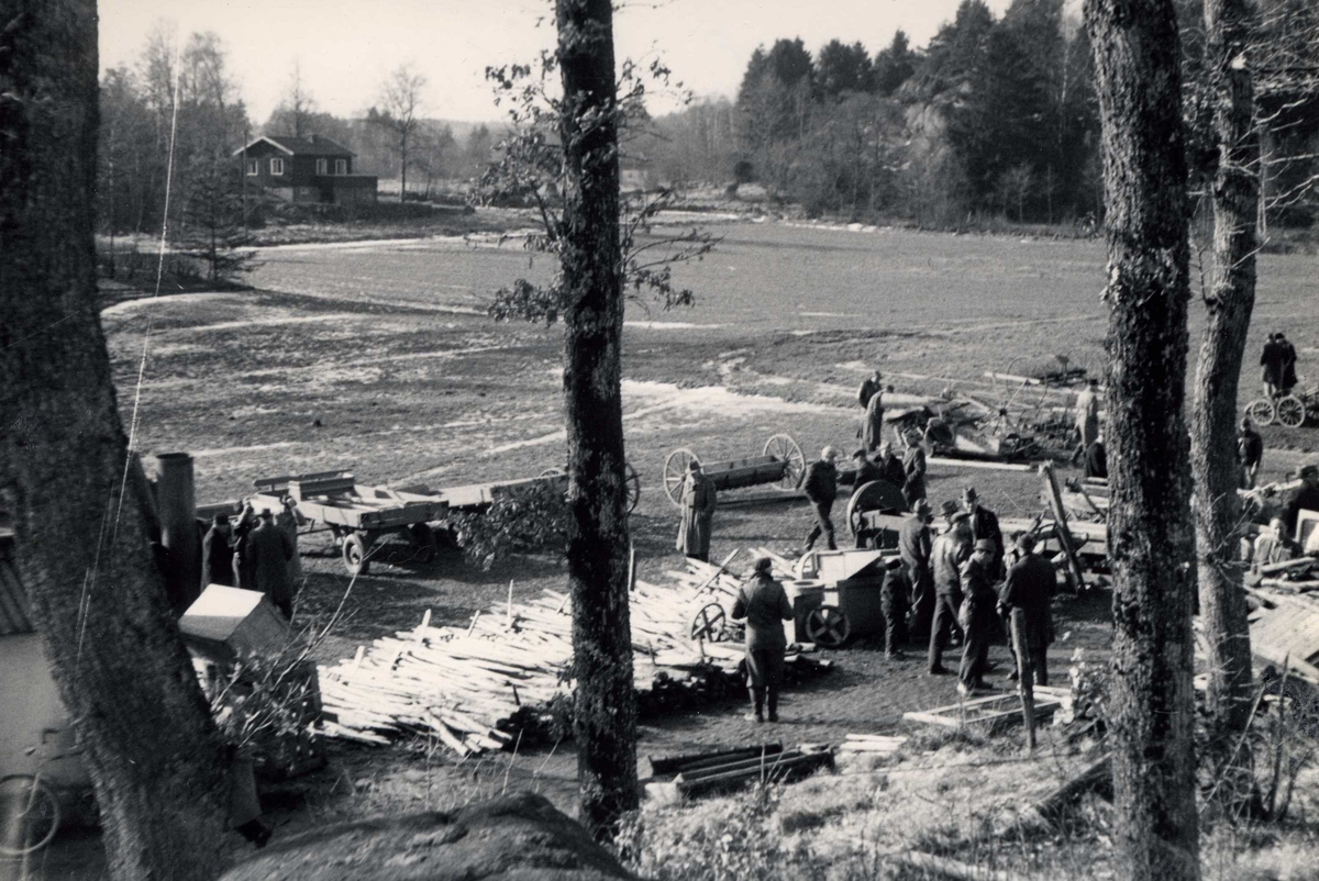 Bölet 1:4 "Larssons" på Böletvägen, cirka 1955 - 59. Flera personer deltar vid en auktion hållen på yttre inventarier vid gårdens försäljning och rivning. Viktor och Emma Larsson byggde nytt hus på Böletvägen 4. I bakgrunden ses en sommarstuga.