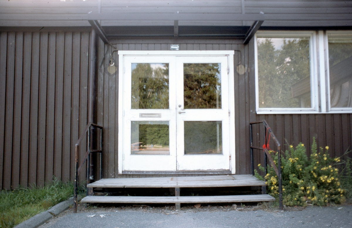 Entré till Kållereds kommunalkontor, Vommedal Västergård cirka 1980. Byggnaden var baracker som först användes som kommunalkontor och sedan distriktssköterskemottagning (BVC). Byggnaden blev skolannex till Brattåsskolan, när Brattåsgården byggdes här 1986. Därefter flyttades baracklokalerna till Blixåsbanan. Relaterade motiv: A1993 och A1995.