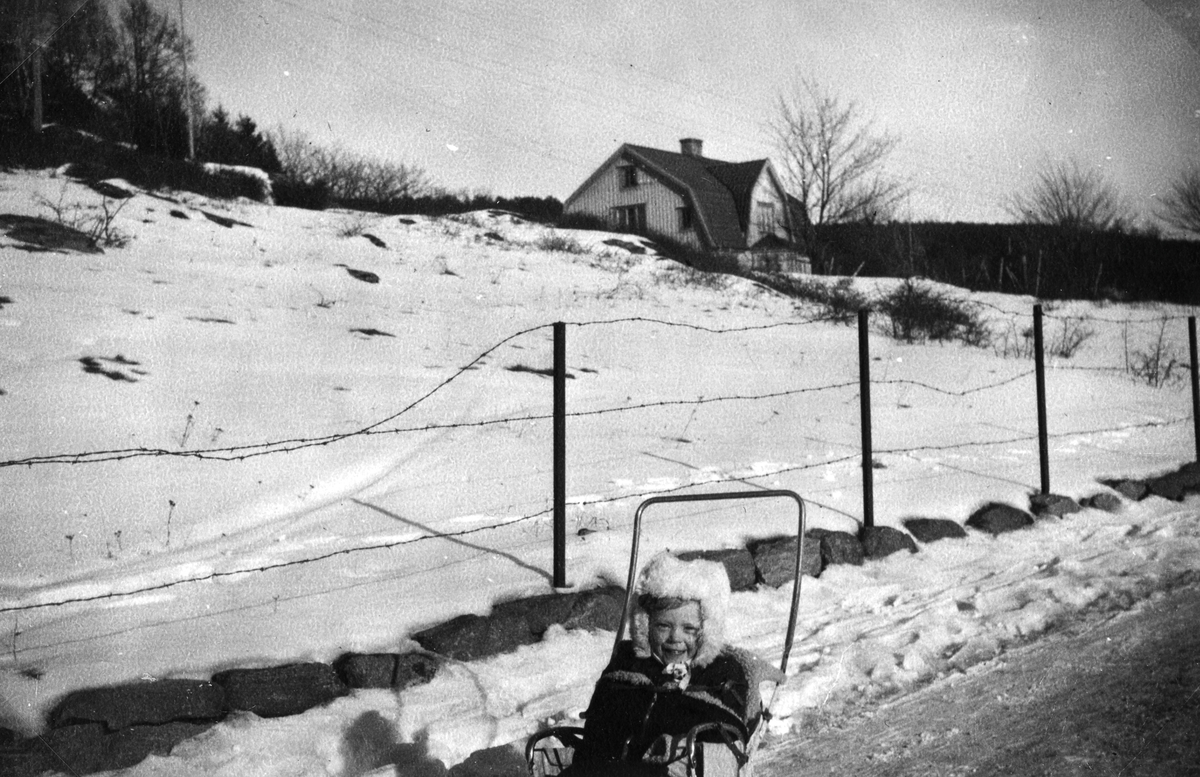 Eva Pettersson (född 1944, gift Kempe) sitter i kärra utanför det snötäckta "Rothvalls" Vommedal Östergård på Streteredsvägen 27-29 år 1946. Dotter till Bror och Rosa Pettersson.