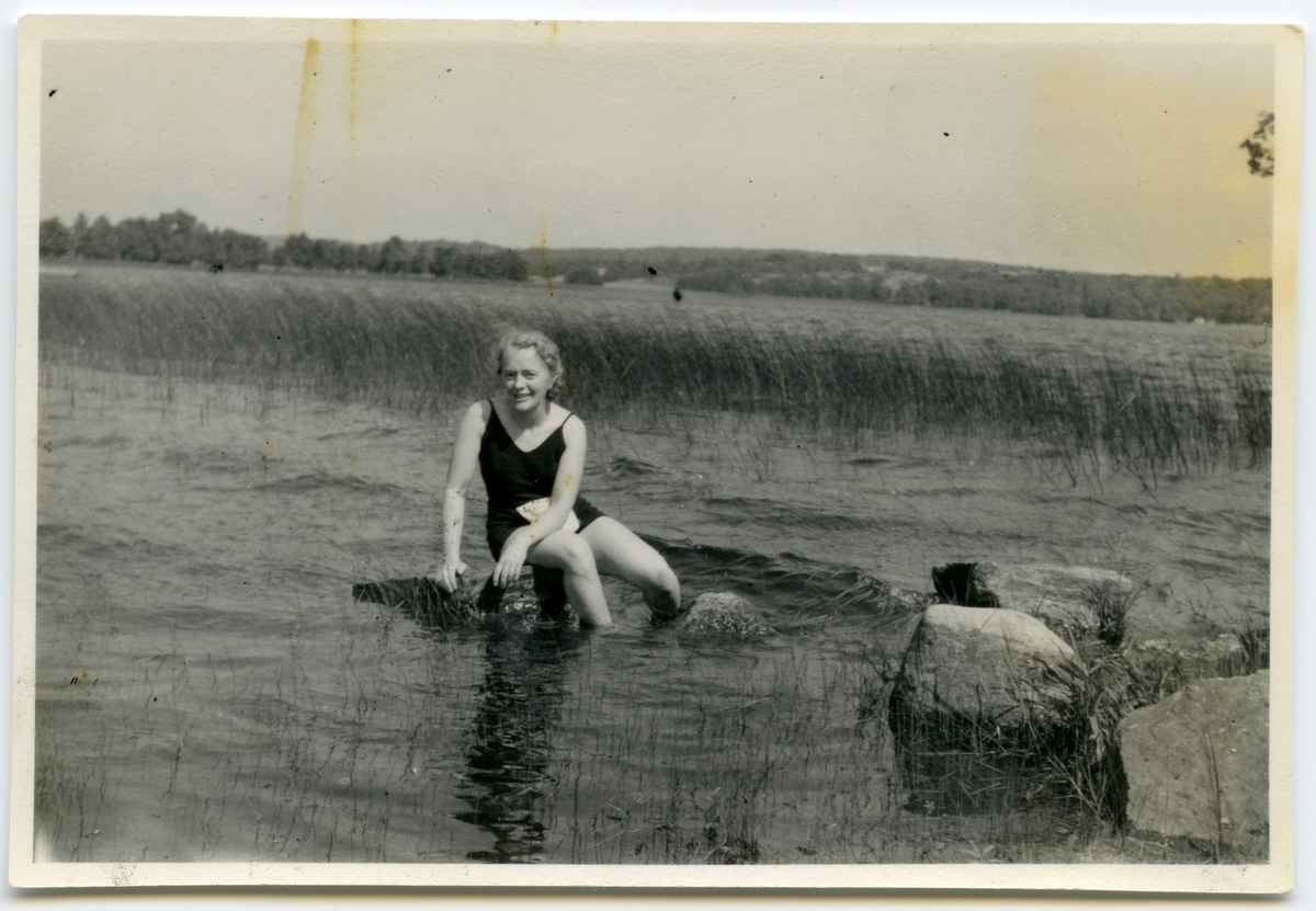 Rosa Krantz (1912 - 1994, gift Pettersson) sitter på några stenar i Tulebosjön vid Stretered, 1922-25. Rosa var mamma till givaren samt dotter till Carl och Nora Krantz (anställda på Stretereds skolhem).