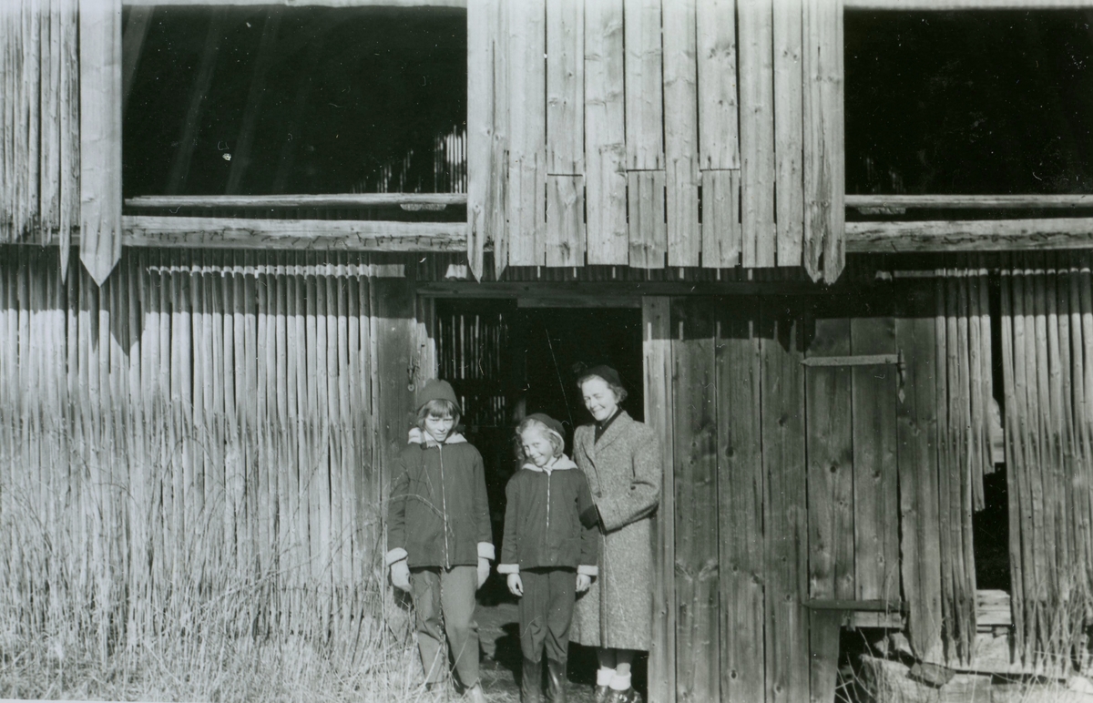 Rosa Pettersson (1912 - 1994) och döttrarna Eva (född 1944, gift Kempe) och Karin (född 1947, gift Hansson) står framför den gamla torvladan på Stretereds utmarker, år 1956. Ladan byggdes cirka 1870 - 1890 under Mellgrens tid.