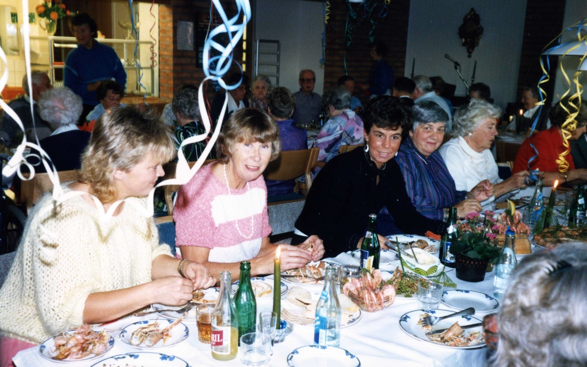 Kräftskiva i Brattåsgårdens matsal (Streteredsvägen 5) där girlanger hänger i taket, 1990-tal. Andra person från vänster: vårdbiträde Greta Nilsson och vårdbiträde Lillvi Häggsten.