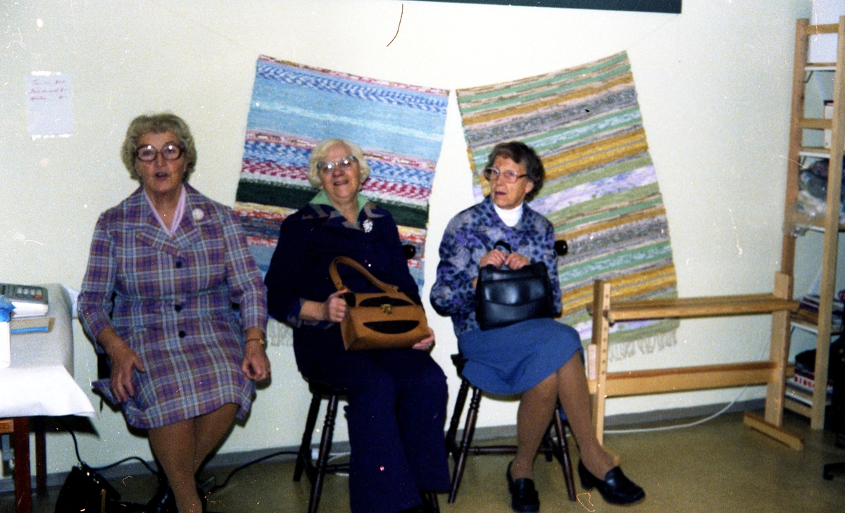 Julförsäljning av hantverk i pensionärernas hobbylokal på Våmmedalsvägen år 1977. Från vänster: Hulda Olsson, okänd kvinna samt Valborg Smitt (1901 - 1986). Bakom kvinnorna hänger två handvävda mattor på väggen.