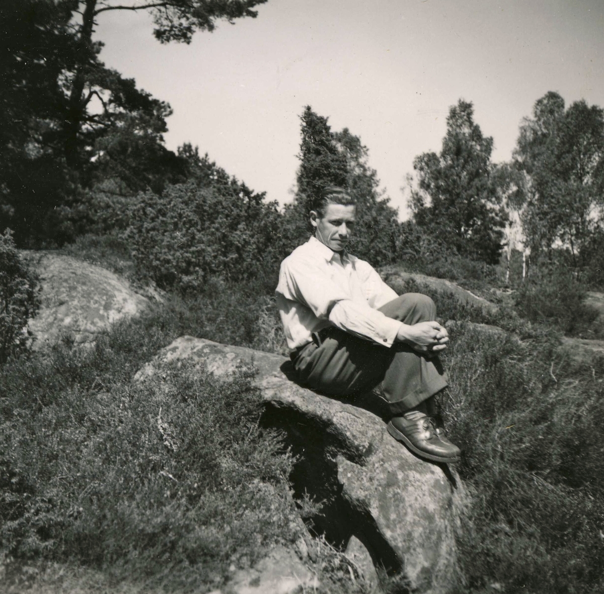 Rolf Svensson (1909 - 1989), iförd basker, sitter på en stenbumling vid Ekans gård, Ekan 1:1, år 1953. Han ägde och brukade gården.
