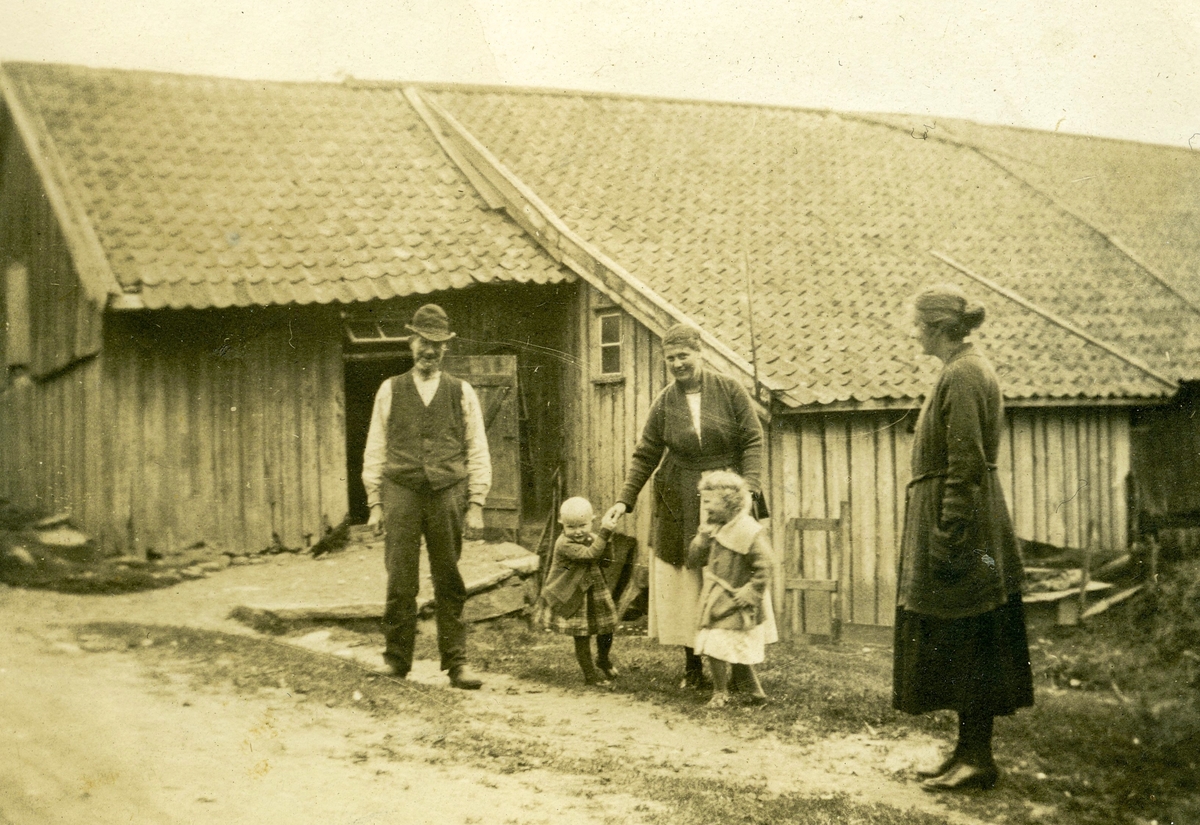 Tre vuxna och två små barn står utanför ladugården vid Livered "Majas" (idag: Streteredsvägen 36) cirka 1900-1910. Från vänster ses Karl Andersson, en okänd kvinna med två små barn samt Karin Andersson (Karls dotter).