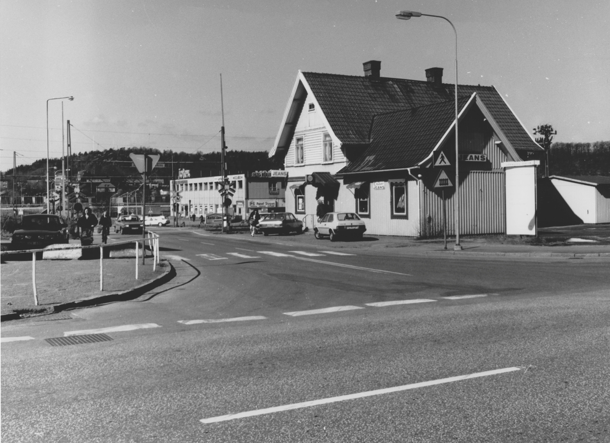 Kållered Station västerut, april 1988. Caiber jeans drev affär i bottenvåningen. Främst ses Gamla Riksvägen i centrum.