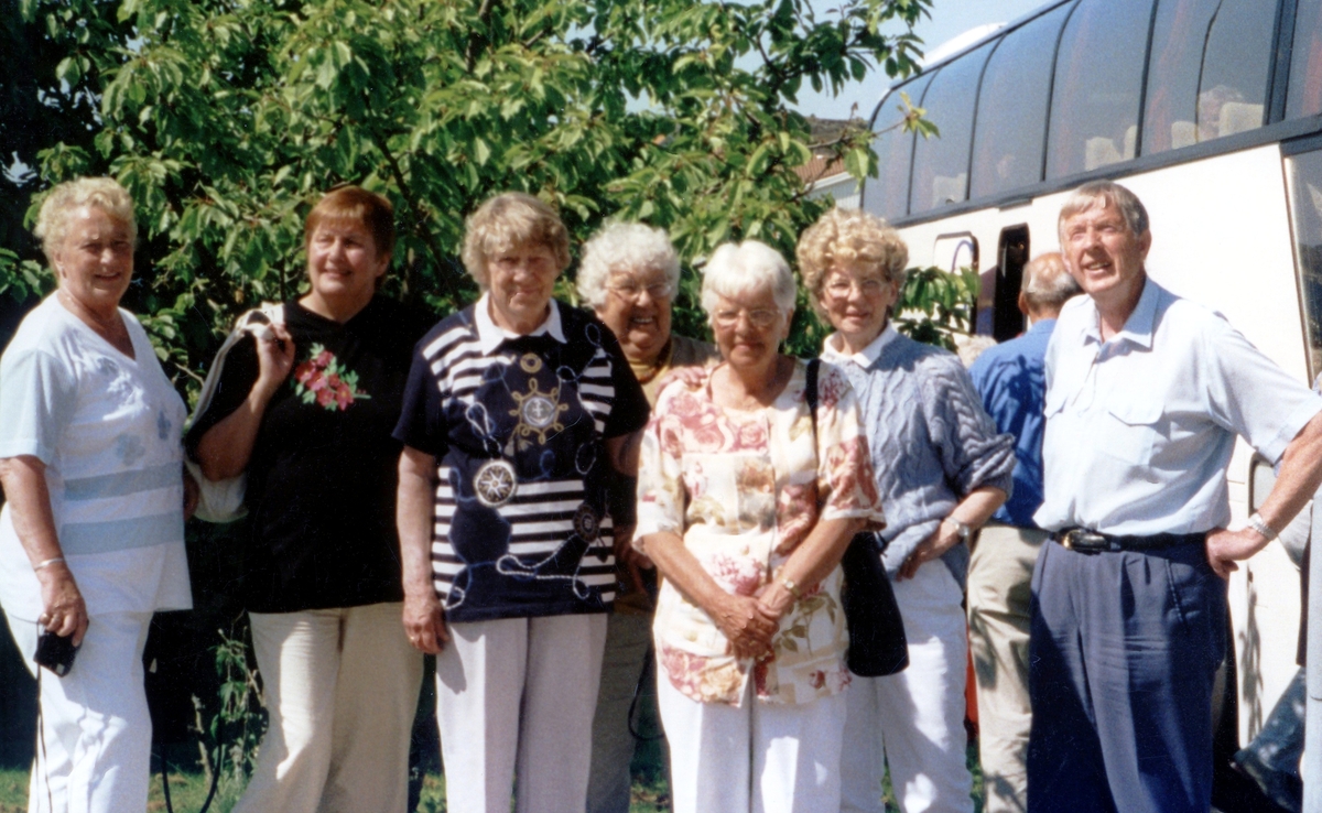 PRO Kållered är på utflykt till Bohuslän, 2000-tal. Från vänster: 1. Britta Olsson, 2. Okänd kvinna, 3. Gördis Johansson, 4. Eivor Bjerrhede, 5. Okänd, 6. Okänd samt 7. Gunnar Hallsberg.