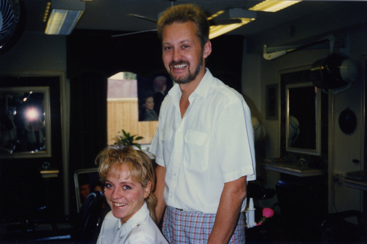Frisören och ägaren Leif Westerberg står bakom en kund (okänd kvinna) som sitter i en stol, Hårmarkarna i Kållered cirka 1990.