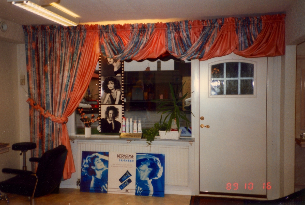 Entrén till Hårmakarna cirka 1989. Interiör från salongen på Våmmedalsvägen 10 i Kållered. Ägare var Leif och Lena Westerberg.