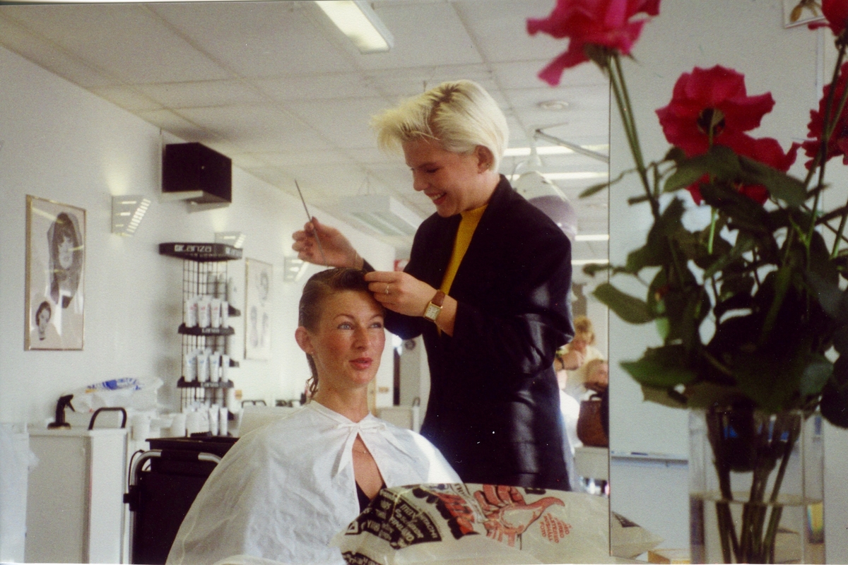 Salong Hårmarkarna på Våmmedalsvägen 10 i Kållered, cirka 1990. Jill sitter i stolen och blir klippt av en okänd frisörska. Jill arbetade som frisör i salongen.