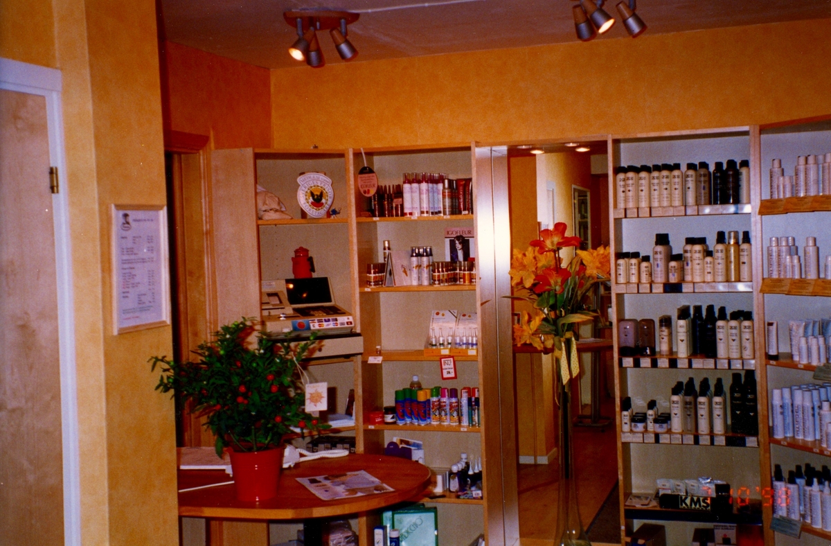 Hyllor med hårvårdsprodukter. Interiör i salongen Hårmakarna på Våmmedalsvägen 10 i Kållered, 1990-tal. Ägare var Leif och Lena Westerberg.