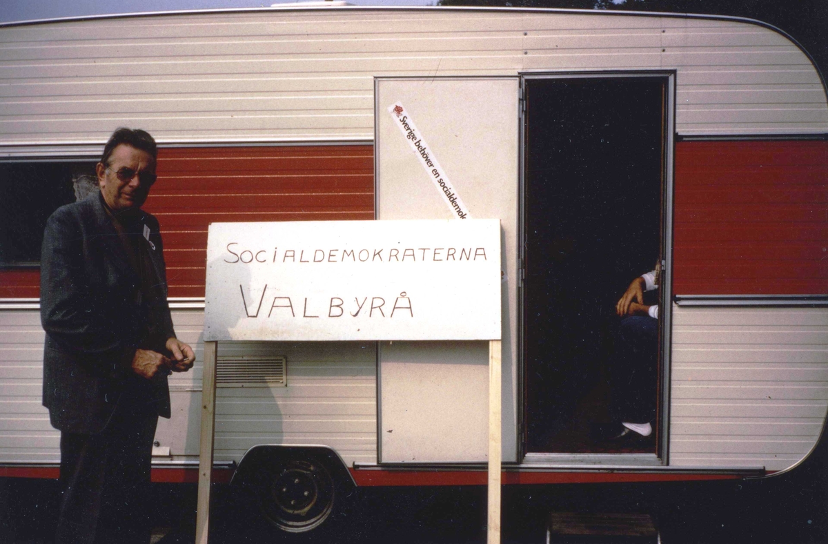 Socialdemokraternas valrörelse i Kållered centrum år 1985. Framför den vit/röda husvagnen, vid skylten "Socialdemokraterna Valbyrå", står S-politikern Sigvard Larsson. Inge Börjessons händer och fötter skymtar innanför dörren.