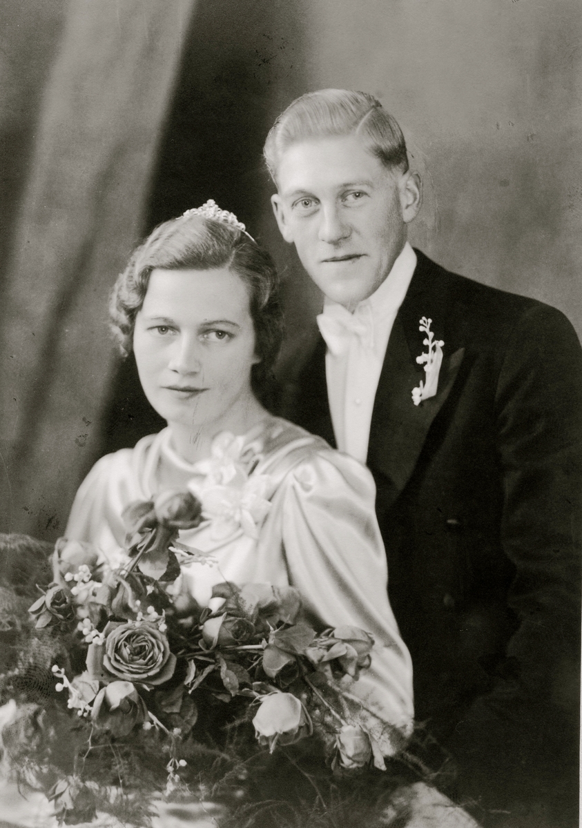 Bröllop i Kållered 1936-11-29 mellan Astrid Gustavsson (1907 - 1994), Nygård i Kållered och Stig Jägerström (1903 - 1977), Råda i Mölnlycke. Relaterat motiv: A2995.