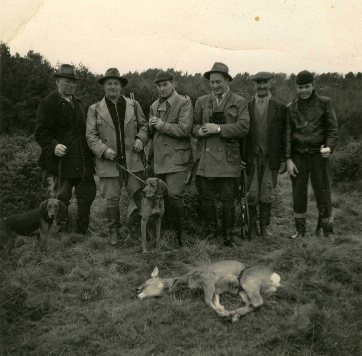 Ett jaktlag bestående av sex män och två hundar står bakom ett fällt rådjur, Kållered okänt årtal. Från vänster: 1. Hilding Johansson, Kålleredgården. 2. Karl Erik Persson (1919 - 2017). 3. Okänd. 4. Okänd. 5. David Bengtsson (1889 - 1977), Långåker. 6. Kjellman?.