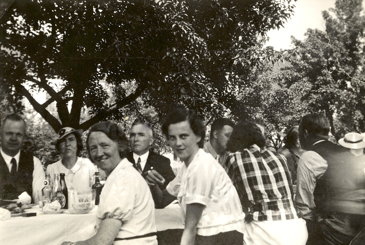 Stretered vårdhems personal som nyss har ätit. De sitter vid ett uppdukat bord utomhus i Slagsta (Botkyrka kommun) år 1936. I mitten ses kostymklädde Carl Krantz (1880 - 1956). Övriga personer är okända. Carl arbetade som skomakare och undervisade funktionshindrade personer på Stretereds skolhem/vårdhem.