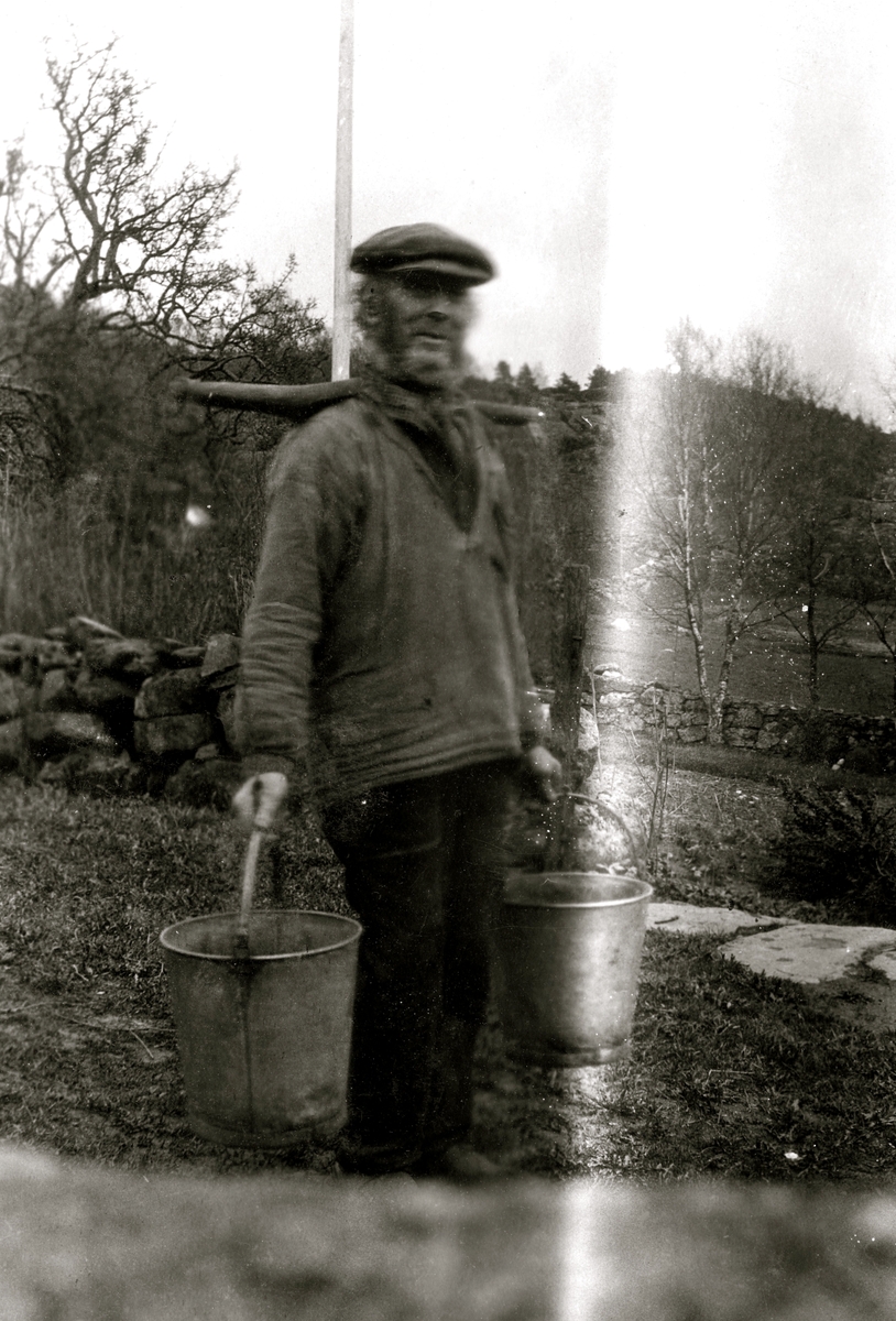 Alfred* Leonard "Sjöfarta" Johansson bär spänner med hjälp av ett ok på axlarna, Backen Högen 1940-tal. Född 1876 i Skepplanda, kom som dräng till Birger Pettersson på Högen 1930 och avled 1964 på Brattåshemmet. Det finns många berättelser om honom. Bland annat att han kallades "Sjöfarta" av okänd anledning.