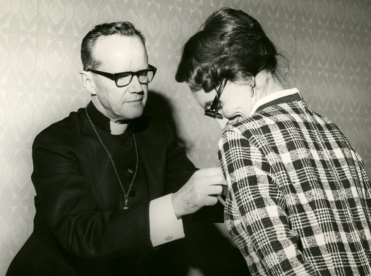 Medaljutdelning av biskop Bo Giertz till Mary Ekman i Församlingshemmet vid Biskopsvisitationen år 1966. Mary Ekman arbetade bland annat som söndagsskollärare.