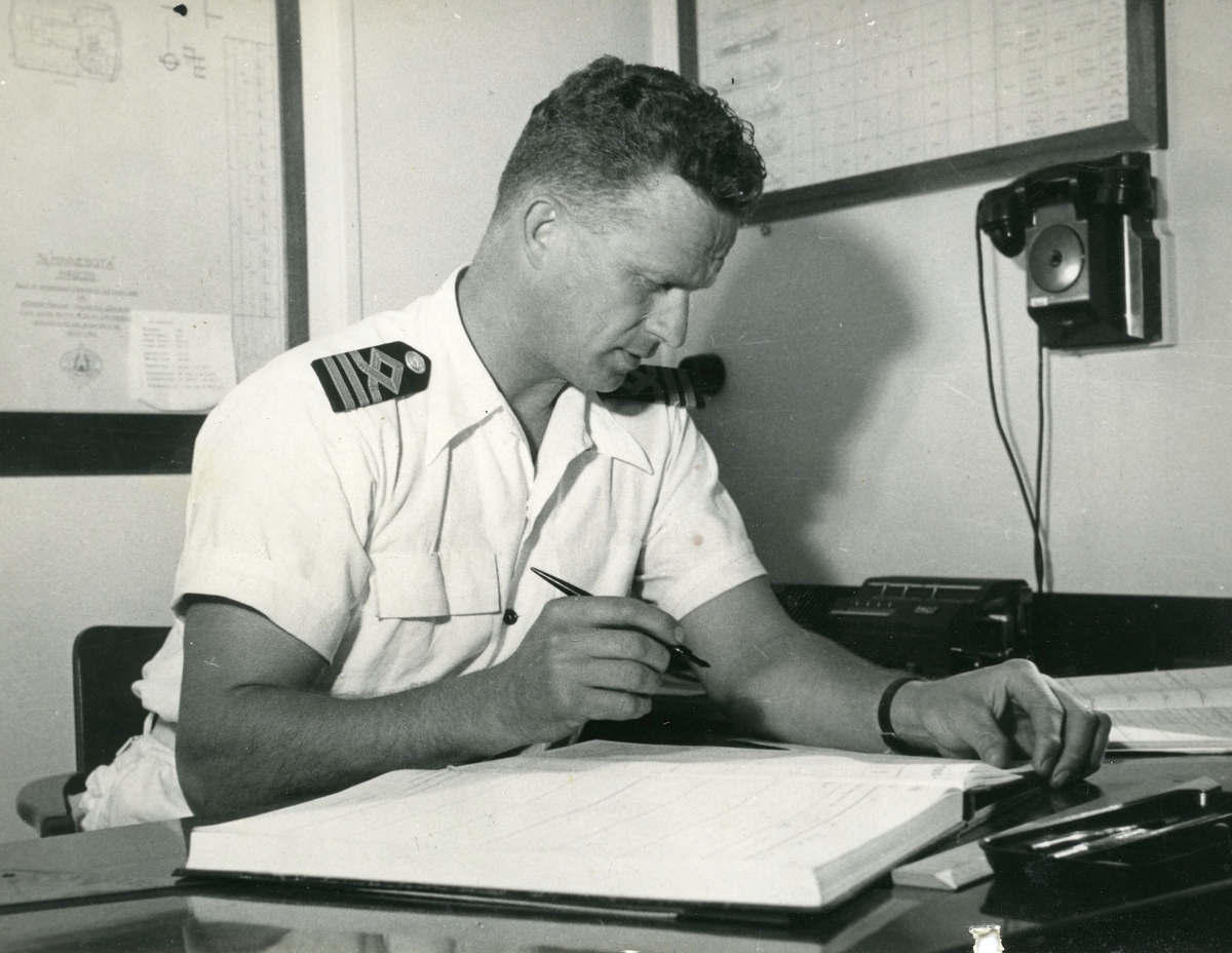 Sjökapten Björn Ekman (1913 - 1992), som överstyrman, på okänt fartyg 1950-tal. Han bodde med hustrun Mary (1920 - 1988) i Vommedal Östergård "Petters" (nu Streteredsvägen 43).