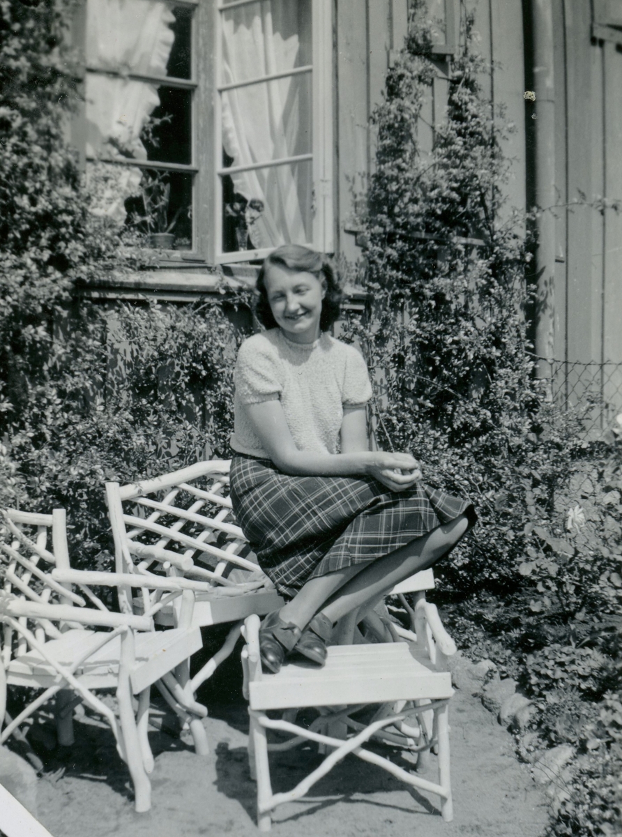 Midsommar 1940. Mary Ekdahl (1920 - 1988, gift Ekman) sitter och poserar på trädgårdsmöblerna utanför föräldrarhemmet i Kålltorp. Hon gifte sig senare med Björn Ekman och paret bosatte sig i Kållered. Relaterat motiv: A2856.