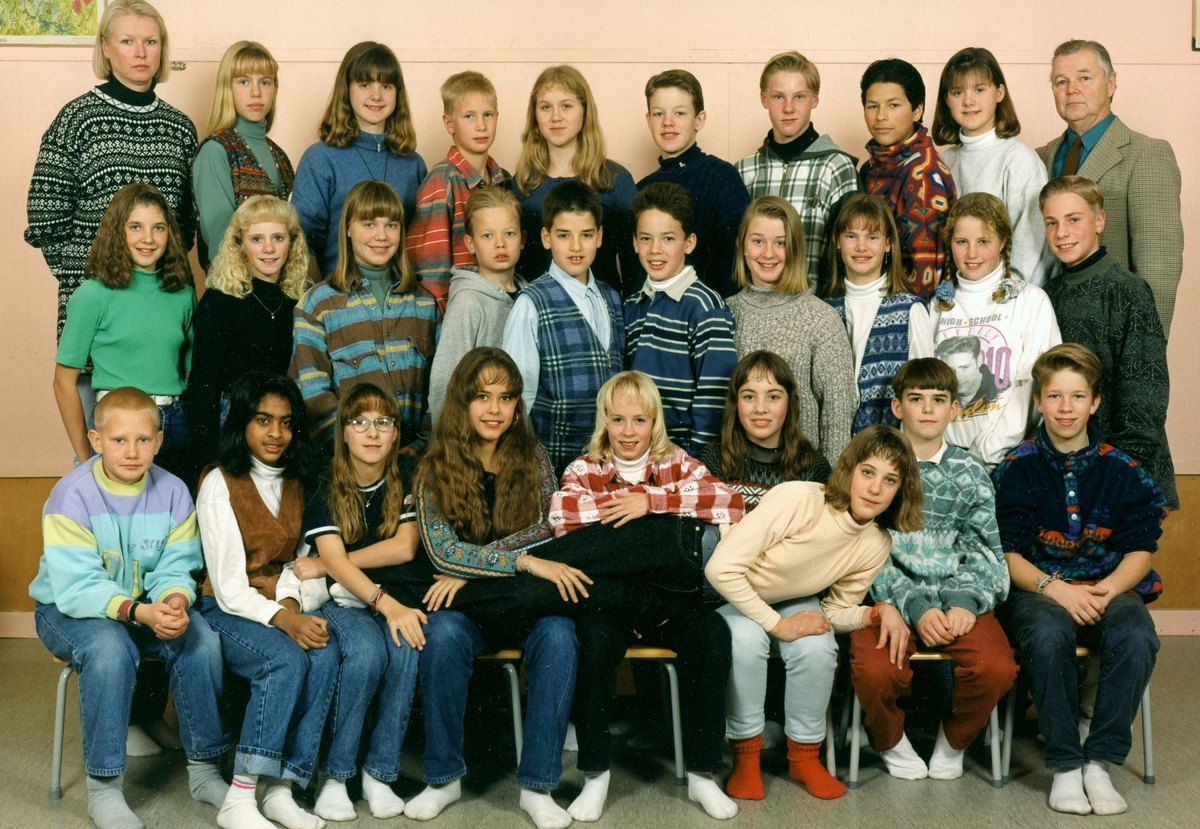 Skolkort på elever, läraren Rolf Werner och okänd assistent, Brattåsskolan november 1993.