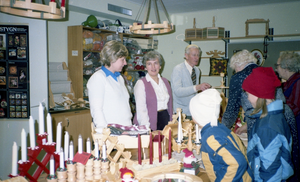 Julförsäljning av hantverk i pensionärernas hobbylokal/träffpunkt på Våmmedalsvägen år 1982. Från vänster står 1. Ingela Bengtsson, terapibiträde. 2. Britt Johansson Norén, terapibiträde. 3. Gösta Magnusson. Övriga namnuppgifter saknas.