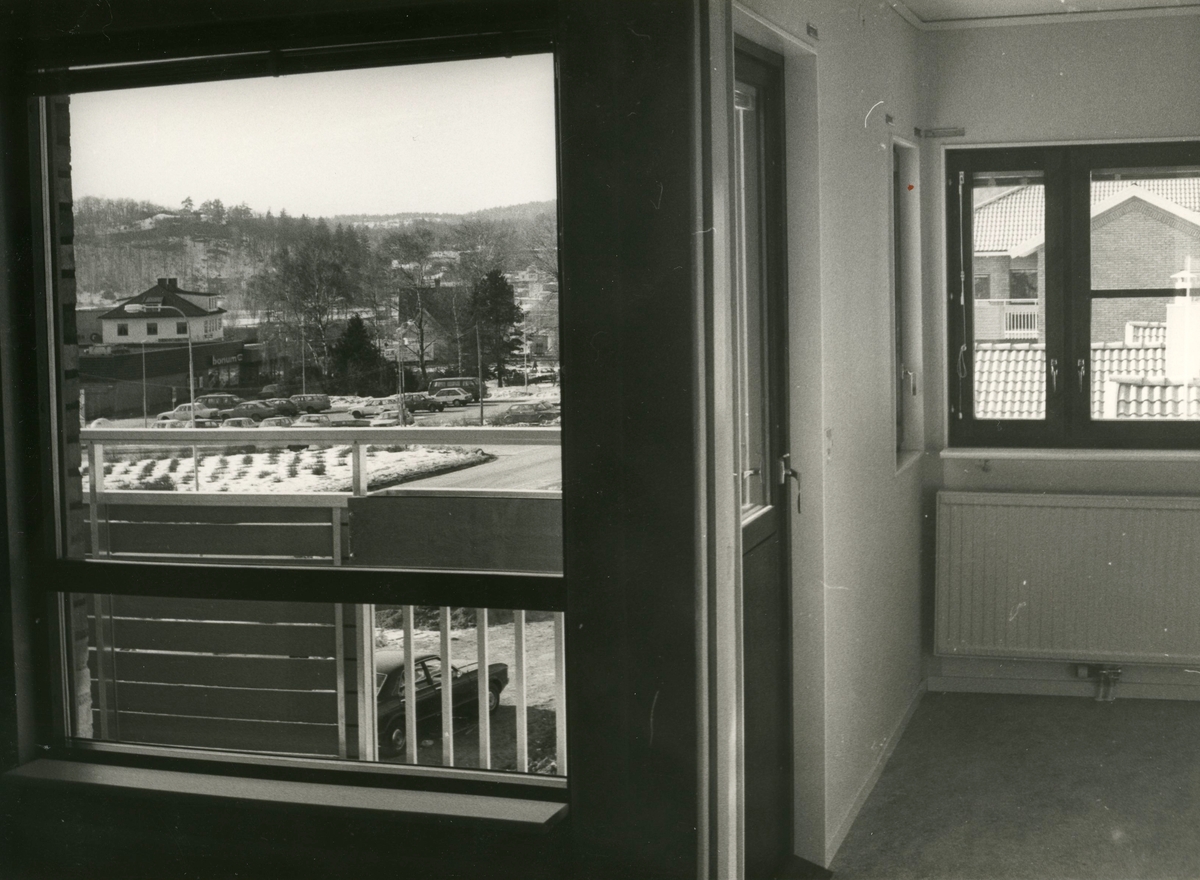 Vy åt vänster inifrån en lägenhet med balkong på Brattåsgården (Streteredsvägen 5), mot Bonums parkering år 1986. Gamla Riksvägen 48A (vit byggnad med burspråk) skymtar i bakgrunden.