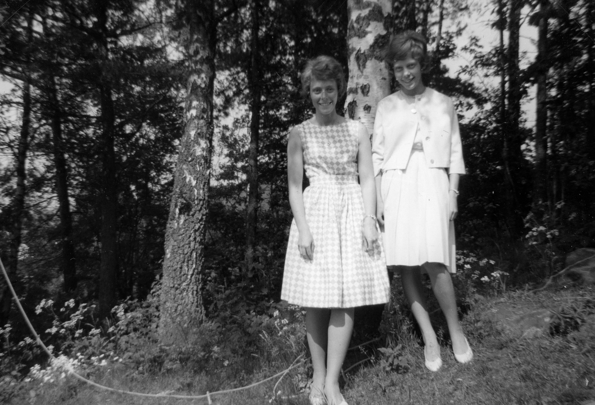 Systrarna Eva (född 1944, gift Kempe) och Karin Pettersson (född 1947, gift Hansson) står finklädda inför skolavslutning, Gamlehagsvägen 17 i Torrekulla år 1961. Döttrar till Bror "Petter" och Rosa Pettersson (född Krantz).