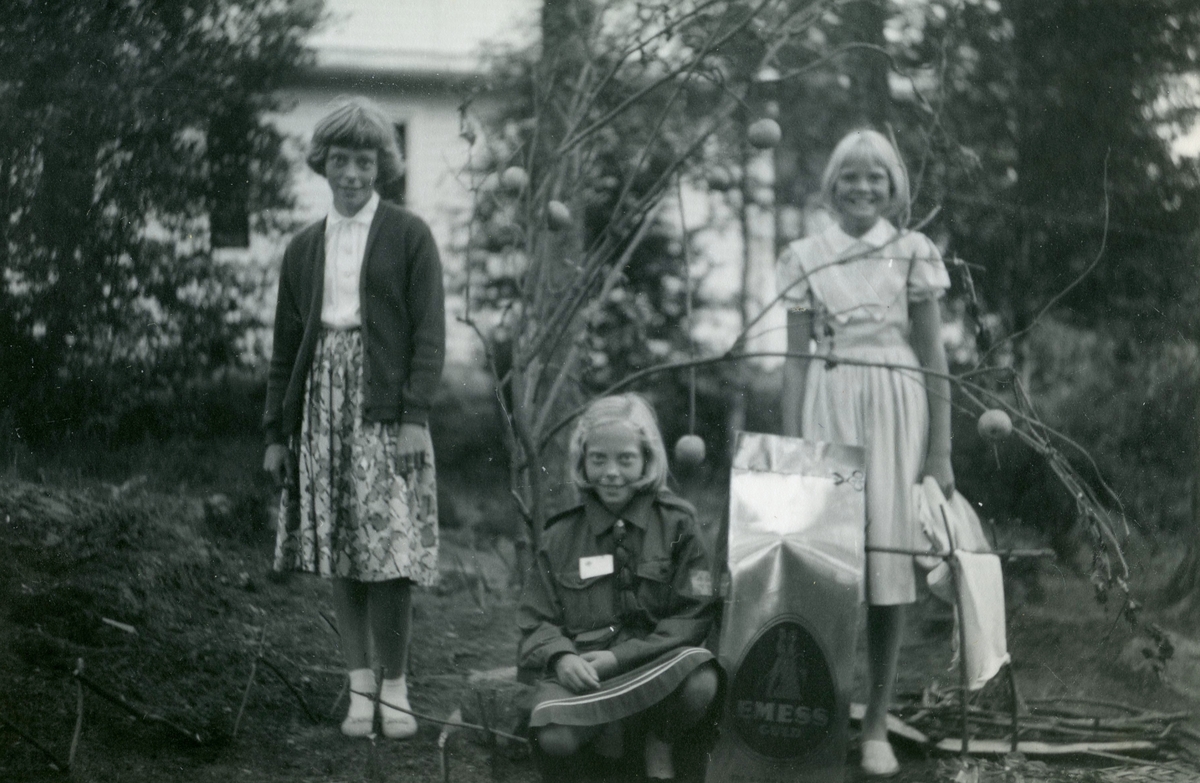 SMUs Scoutläger i Sjövik (Lerum) år 1956. Från vänster: Eva Pettersson (född 1944, gift Kempe), systern Karin (född 1947, gift Hansson) och Inger Svensson. Relaterade motiv: A2265 och A2273.