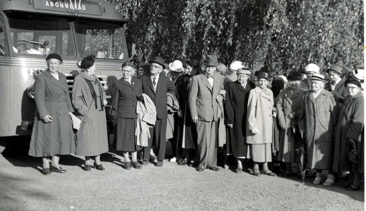 Röda Korsets pensionärsutflykt med abonnerad buss cirka 1955. Samling vid hängboken utanför Kommunalhuset på Streteredsvägen 3 i Kållered. I bakgrunden ses Knipan, där Per Pettersson då bodde.