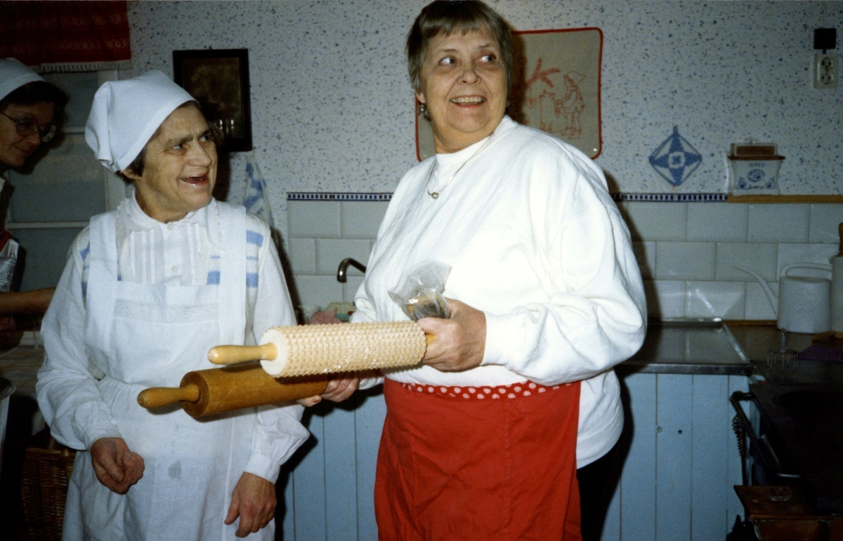 Brödbakning i Hembygdsgården Långåker 1:3, 1980-tal. Från vänster: Dagmar Svensson, Vommedal och Stina Johansson, Labacka.