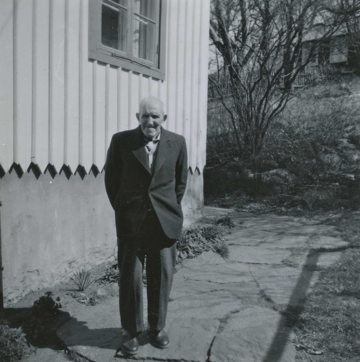 Robert Pettersson (född i Lindome 1886, avliden 1968 på Brattåshemmet) arbetade som dräng på Ekans gård från 1912. Huset till vänster är Börjessons hus på Norra Kyrkvägen 1/Lugnet 1 och i bakgrunden till höger ses Johannes Bengtssons Mekaniska verkstad.
