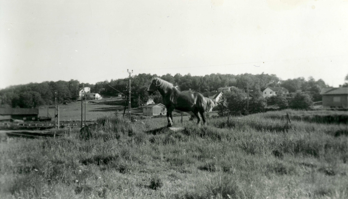 En arbetshäst står på ängsmarken vid Ekans gård, Ekan 1:1, i Kållered år 1953. Till vänster ligger Backen "Adolfs" och i bakgrunden skymtas villor i Kyrkbacken - Stomvägen.