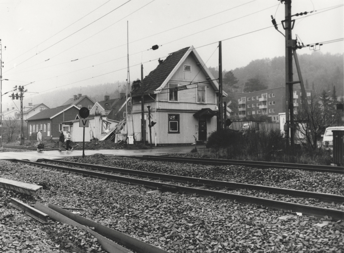 Järnvägsspåren vid Kållered Station 1991-05-13. Caiber jeans drev affär i bottenvåningen. Den mörka byggnaden med lägenheter som skymtas i bakgrunden till höger ligger på Streteredsvägen 1A - 1G.