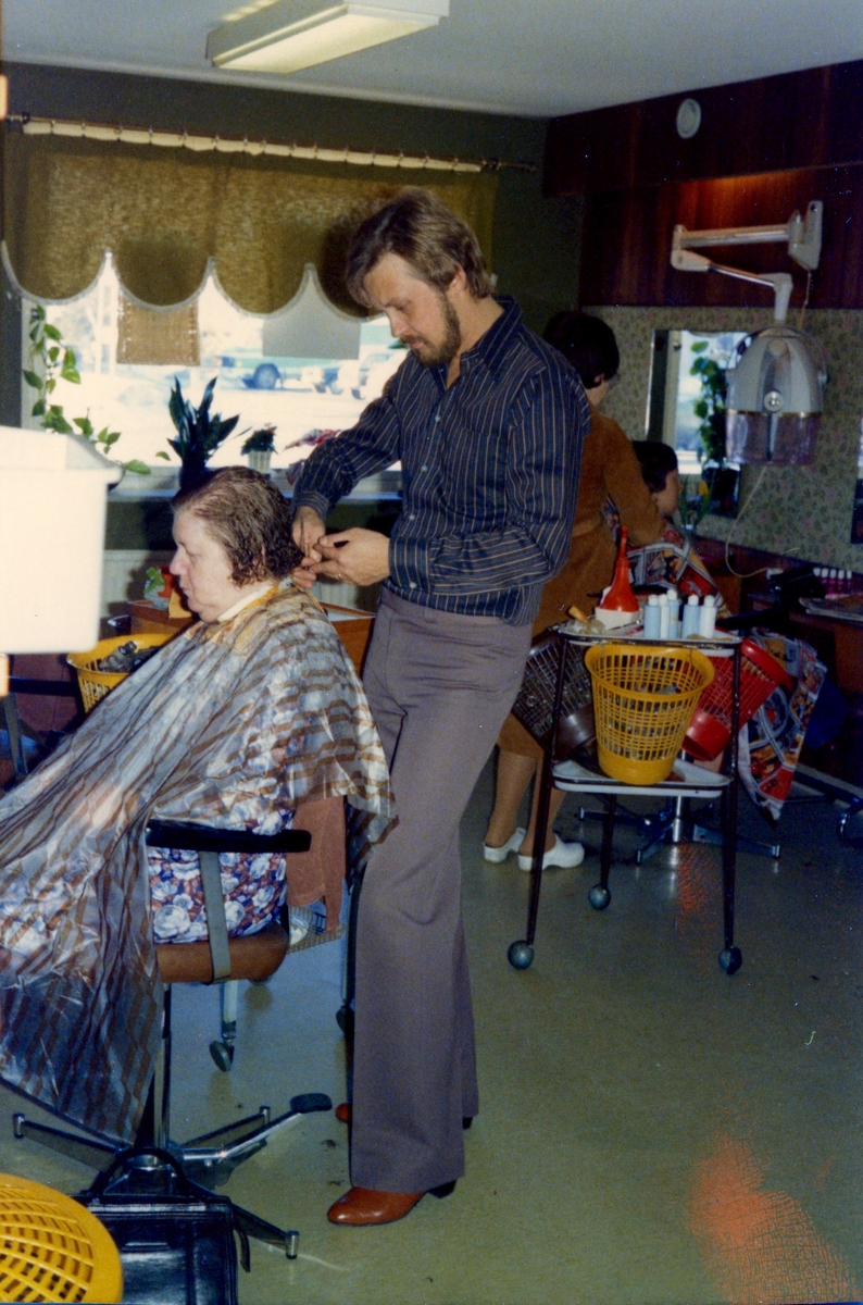 Frisören och ägaren Leif Westerberg klipper en kund (okänd kvinna) som sitter i en stol, Hårmarkarna på Våmmedalsvägen 10 i Kållered 1980-tal.
