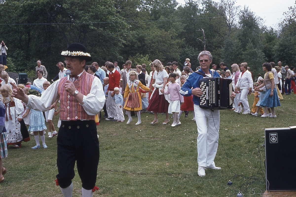 Barn och vuxna dansar kring stången vid midsommarfirande på Ekensås cirka 1982. Sångare/ledare är Olle Svensson (klädd i folkdräkt) samt spelmannen Frank Efraimsson som spelar dragspel.